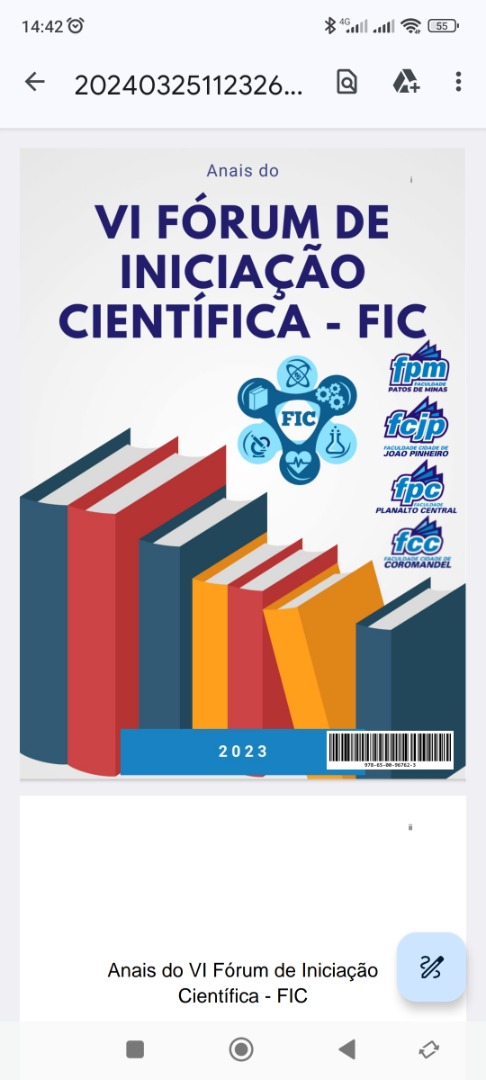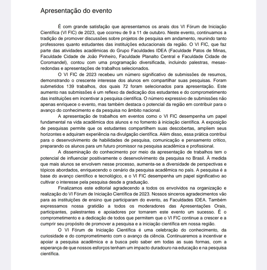 O livro de resumos do 6º Fórum de Iniciação Científica pode ser acessado através do link permanente do FIC: [ https://faculdadepatosdeminas.